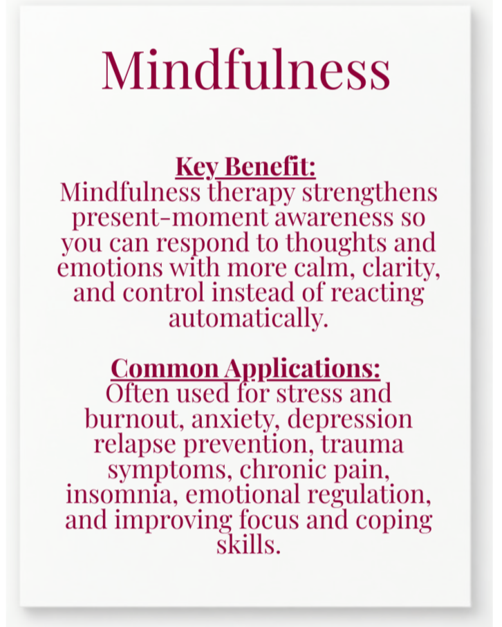 Individual therapy (talk therapy) is a supportive space to explore your thoughts, feelings, and experiences, helping you heal and improve overall well-being.